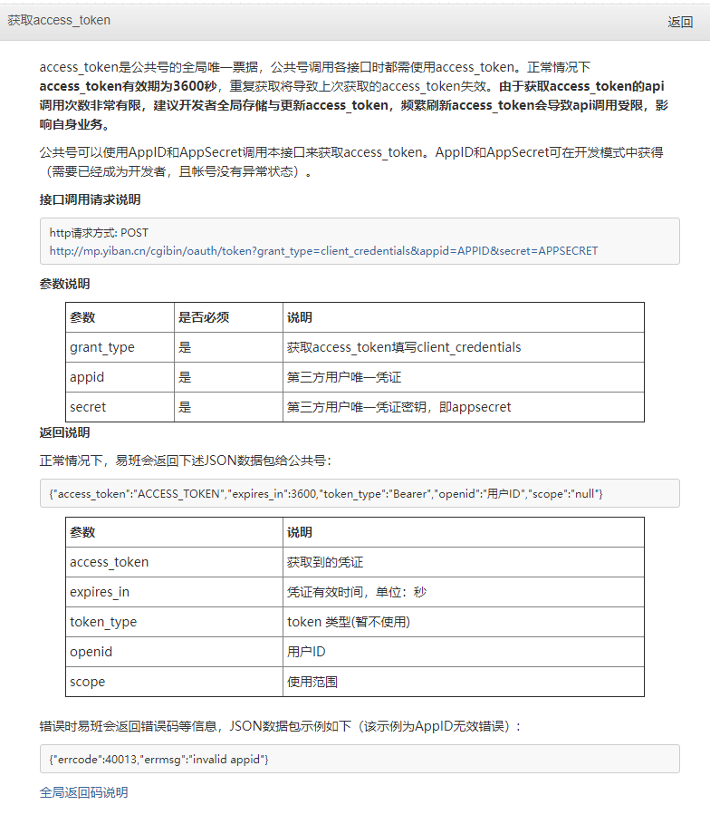 它的文档如是说,post到http://mp.yiban.cn/cgibin/oauth/token?grant_type=client_credentials&appid=APPID&secret=APPSECRET, 然而经过我的实验,并不是如此。