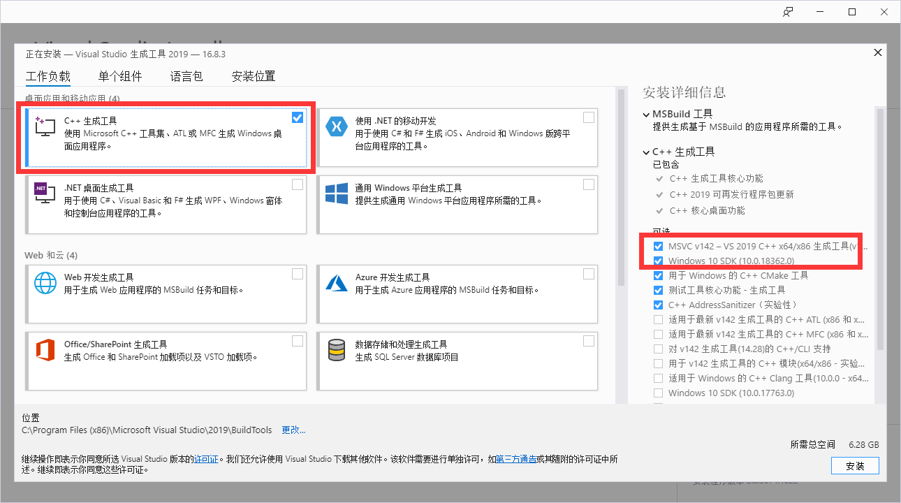 在安装时,应当选择下图所示左侧的 C++ 生成工具,它将自动为你勾选右侧所示的五个依赖,其中最上面两个选项——“MSVC v142 - VS 2019 C++ x64/x86 生成工具”和“Windows 10 SDK”是必须要的。其他的你可以选择不要,但也不占多少空间,建议不要去掉。